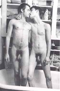o innocent nudity here. These guys have had or are about to have at each other. My guess is, what with the lit cigarette and no fire in their penises, the deed has been done. The tub has long been a favorite venue for sex. My only question is why are the grocery shelves behind them in the bathroom?
