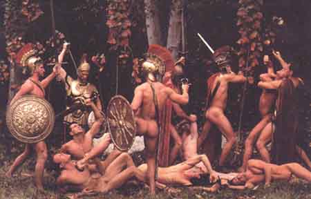 hotographers just could not put down the sword and spear. Instead of one man with one sword or shield as seen in the earlier photos, here there are twelve men using their weapons. They seem a bit posed for the action involving their energies, but the point of most battle scenes has always been that swords are phallic symbols, and the good artist lets us see a little of the real thing in his work.