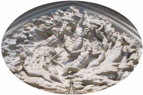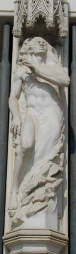 bove the center west door to the National Cathedral (Washington, DC) is the great sculpture (above) showing the creation of "humankind" out of chaos. Ignoring the Genesis account, the artist has men and women created simultaneously. Curiously, the women are full breasted with even their nipples standing out. None of the men are given genitalia. So while the sculpture is politically correct in recognizing the sexual equality of women, men are once again artistically castrated. One has to wonder why artists, churches, and societies can look easily upon a tit but not a dick.
